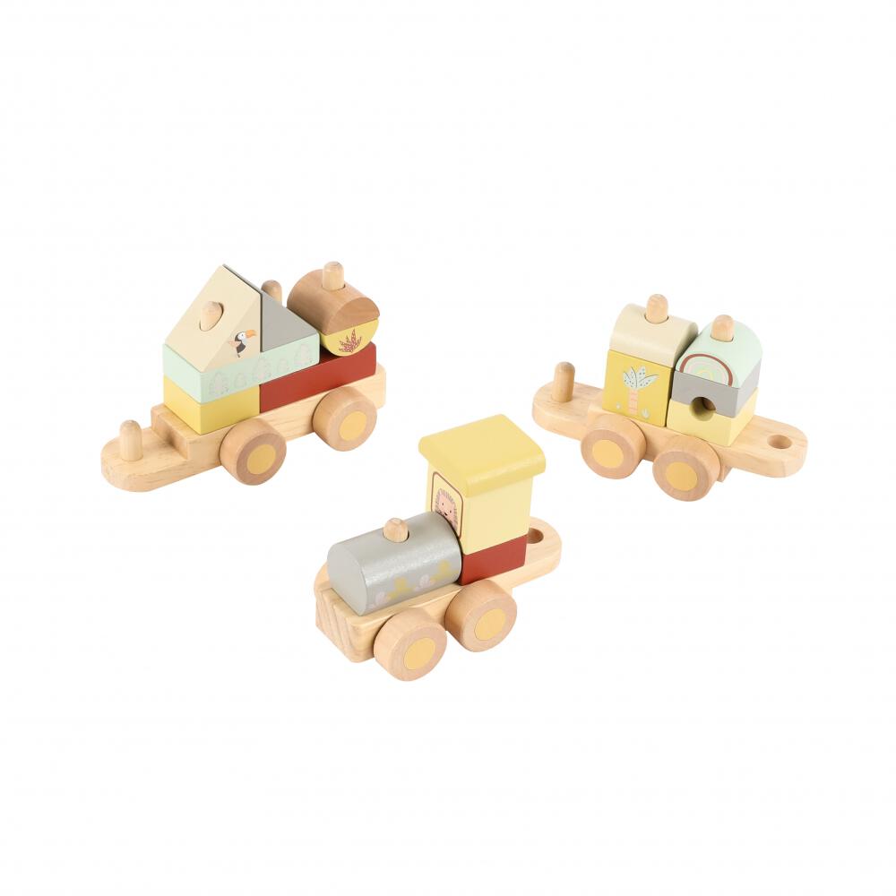 お部屋のインテリアにもぴったり!木製の3車両のトレインセット。カラフルな積み木をのせて運ぼう!組み立てサイズ(約):全長40×奥行き7.5×高さ11cm