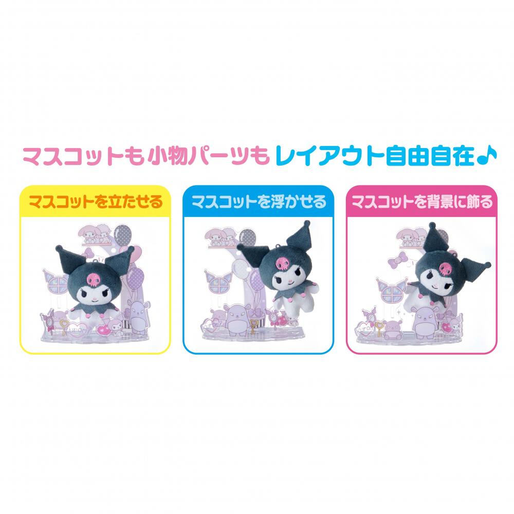 マスコット背面の凸パーツをアクリルの穴にさして、マスコットを立たせたり浮かせたりして飾ることができます。