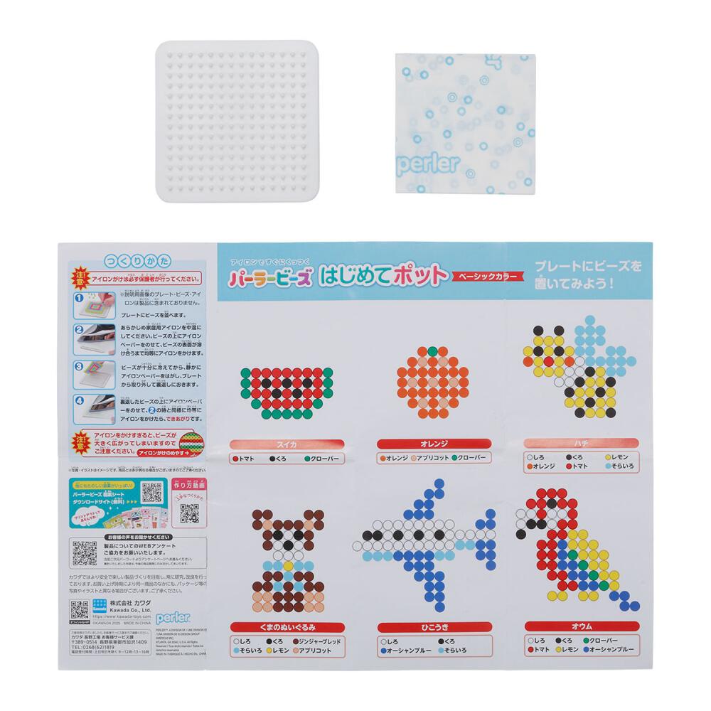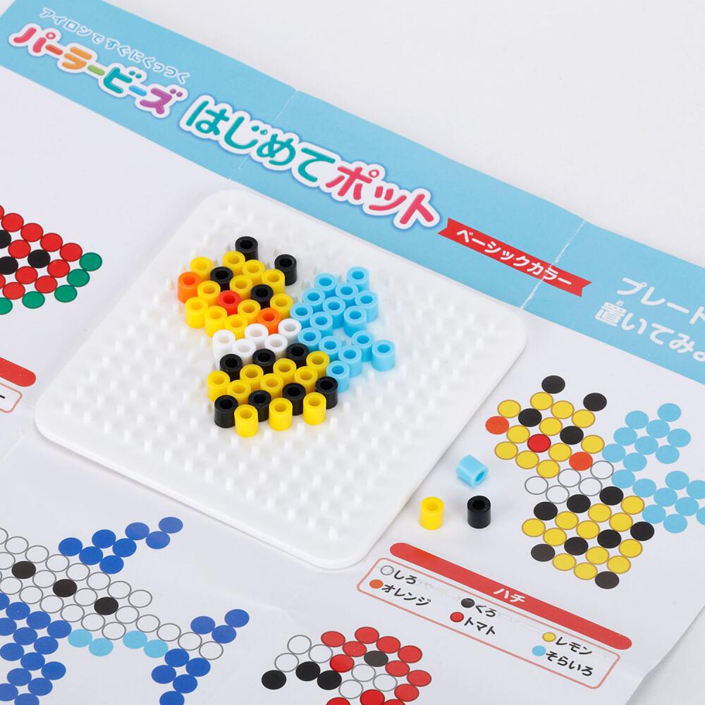 <セット内容>【セット内容】 ミックスビーズ約2,500ピース(全10色 しろ、くろ、ジンジャーブレッド、アプリコット、レモン、オレンジ、トマト、そらいろ、オーシャンブルー、クローバー)、プレートS四角(しろ)×1、図案シート×1、アイロンペーパー×1