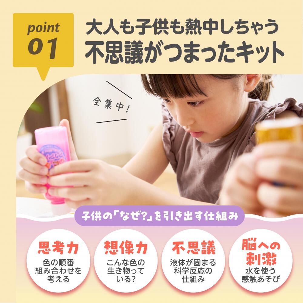 カラーインク12本(キラキラゴールド、キラキラムラサキ、キラキラピンク、みずいろ、ムラサキ、さくら、ピンク、きいろ、きみどり、白、黒×2)凝固パウダー6袋、ミニ水槽、遊び方ブック、型12種類