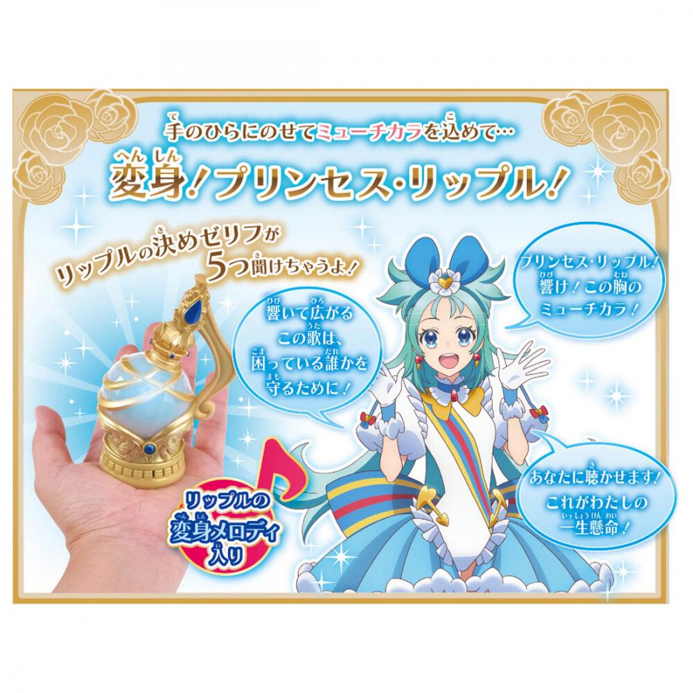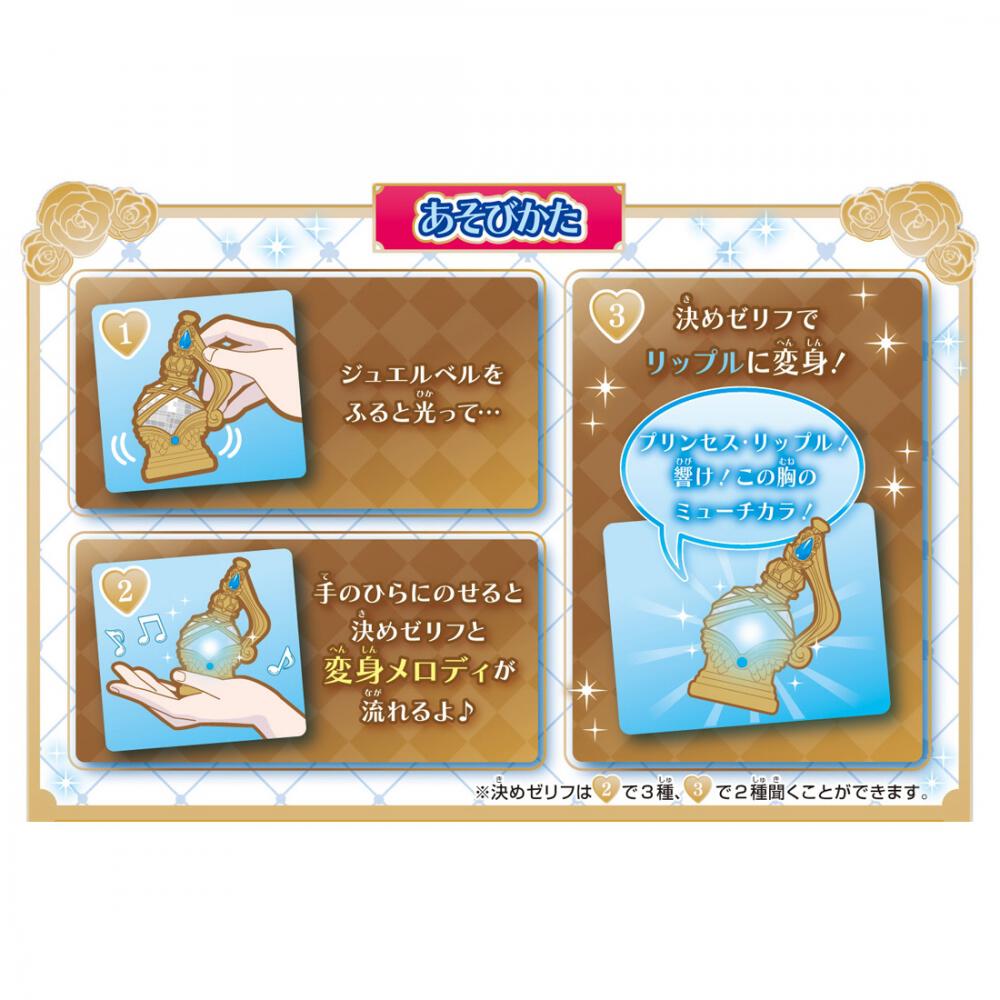 振るとベルの音が鳴って光ります。手のひらにのせるとキャラクターのセリフのあと、変身メロディが流れ、最後に決めゼリフを聞くことができます。手のひらにのせて奏でるメロディ。変身!プリンセス・リップル!