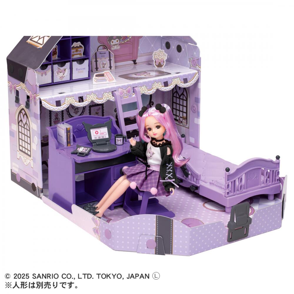4.ロックパーツが付いたバッグ型のおへや。リカちゃん(別売)や家具を一式収納して持ち運びも簡単です。クロミがいっぱいのバッグ型のおへやです。