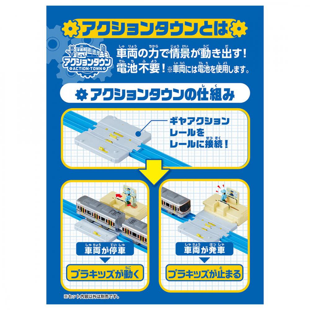 ■別売の「J-29 アクションタウン ホームドア開閉駅」とつなげることができ、車両が停車すると2つのアクションを一緒に遊べます。車両の力で情景が動き出す!アクションタウンのプラキッズ改札駅が登場!