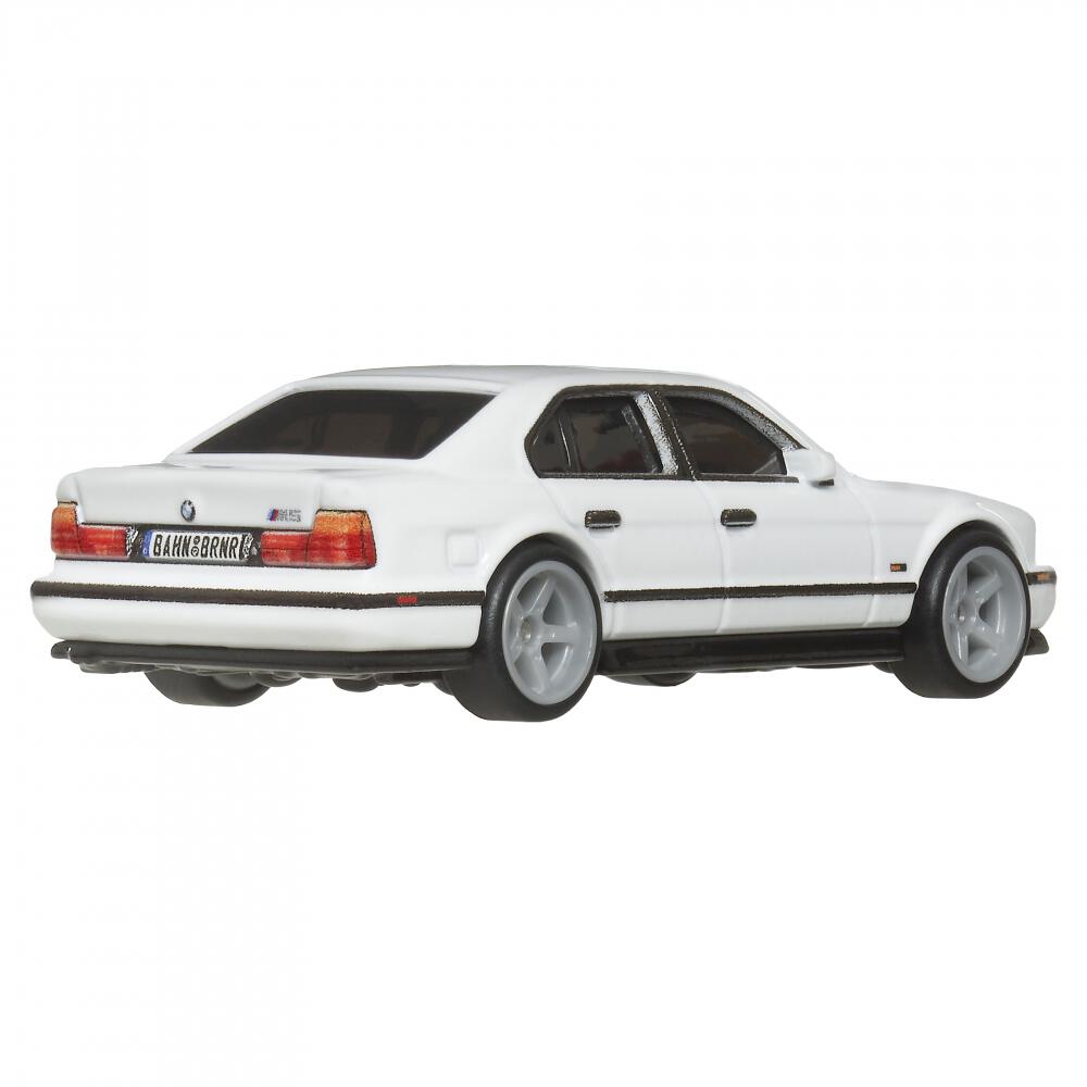BMWの中型(1980年代当時)セダン、5シリーズをベースに同社製のスーパーカーM1をはじめ6シリーズなどスポーツカー用に開発された3.5リッターエンジンを搭載することで、圧倒的な動力性能を誇るスーパーセダンとして1984年に登場したM5。伝統的に一般的なBMW車は、シリーズ名と排気量を組み合わせた3桁の数字が与えられてきたが(例外もある)、BMWのモータースポーツ活動を担当するM社がプロデュースする5シリーズということで、M5が正式車名となる。ホットウィールが題材に選んだのは1988年に登場して1995年まで生産された第2世代のM5で、基本的な生い立ちは初代同様だが、エンジンは最終的に340馬力までパワーアップされ、最高速度は250km/以上を誇った。ホットウィールの1991年型M5は『ワイルド・スピード』シリーズからデビューしたが、前回の黒に続くセカンドカラーが今回の白となる。