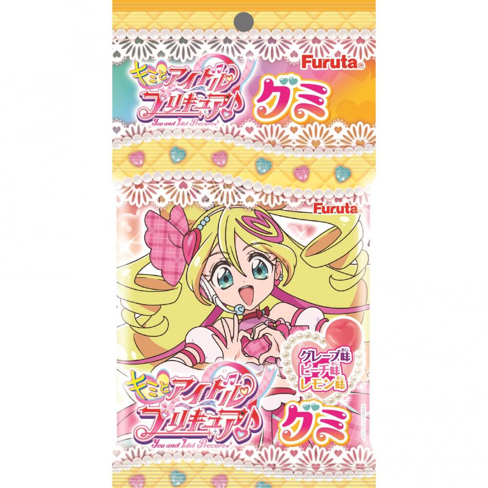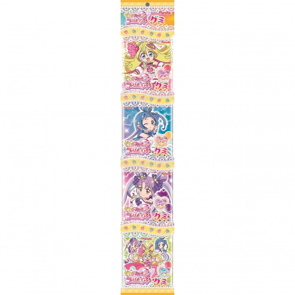 「キミとアイドルプリキュア♪」を起用した4連タイプの吊り下げグミです。グミの味はグレープ、ピーチ、レモンの3種類がアソートされております。