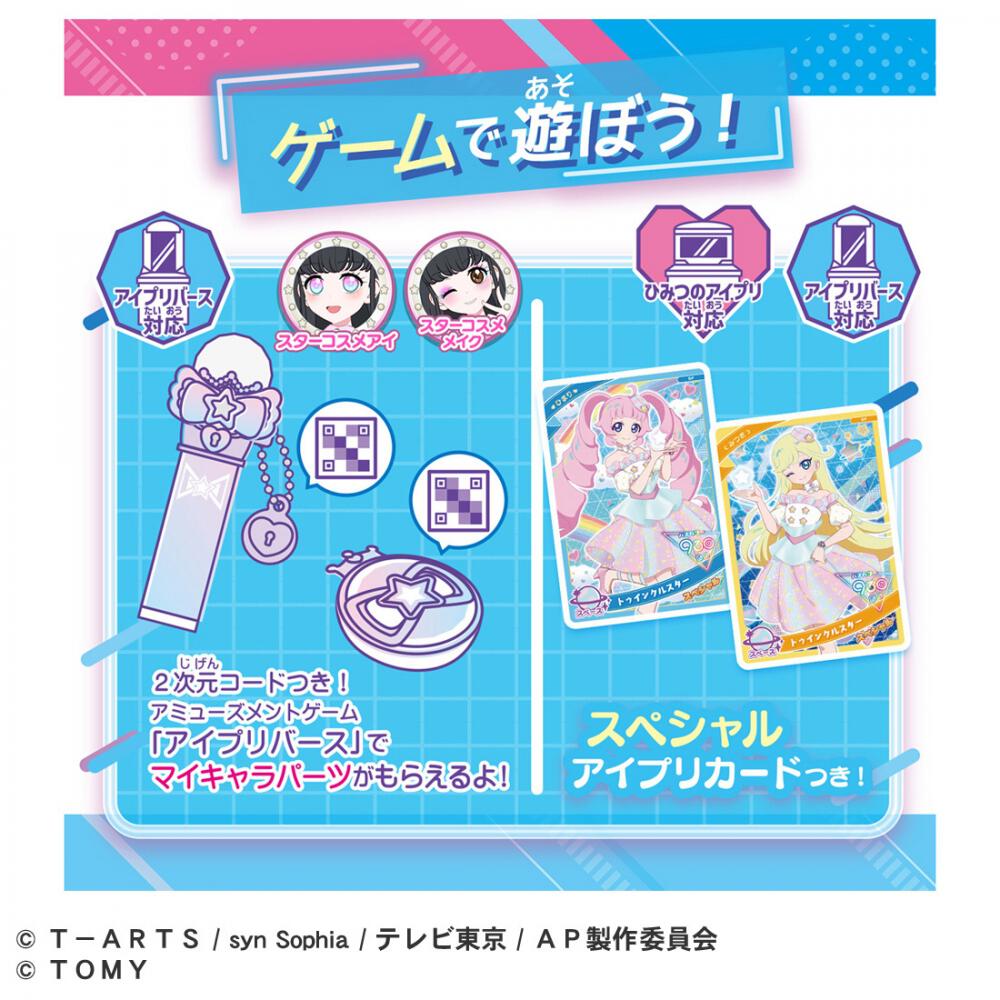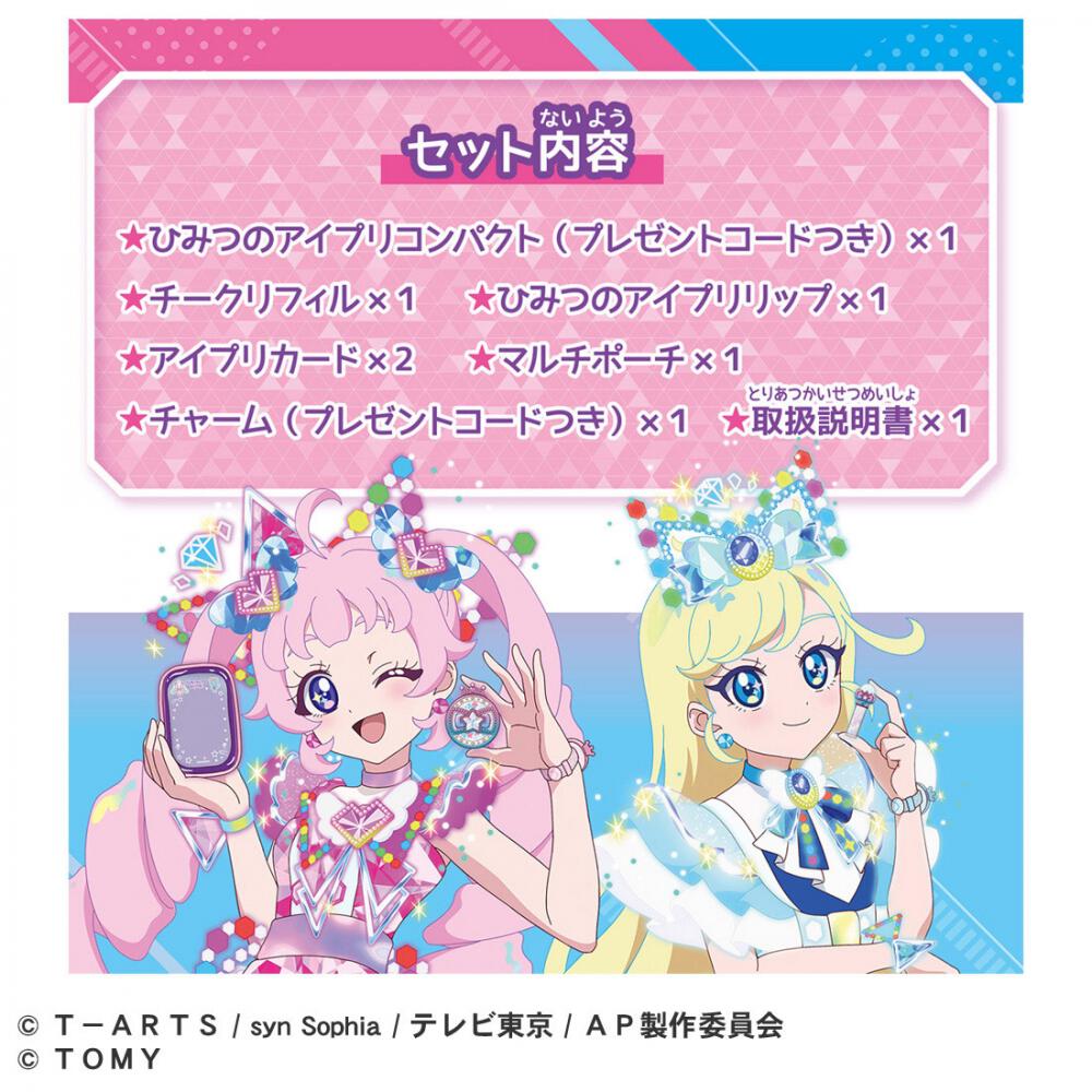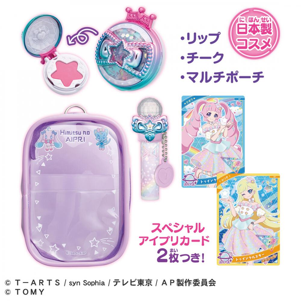 2種類のアミューズメントゲーム「ひみつのアイプリ」「アイプリバース」で遊べるスペシャルデザインのアイプリカード2枚付き。アニメにも登場するリップとチークがコスメセットになって登場!かわいいマルチポーチにリップとチークを入れてお出かけしちゃおう♪