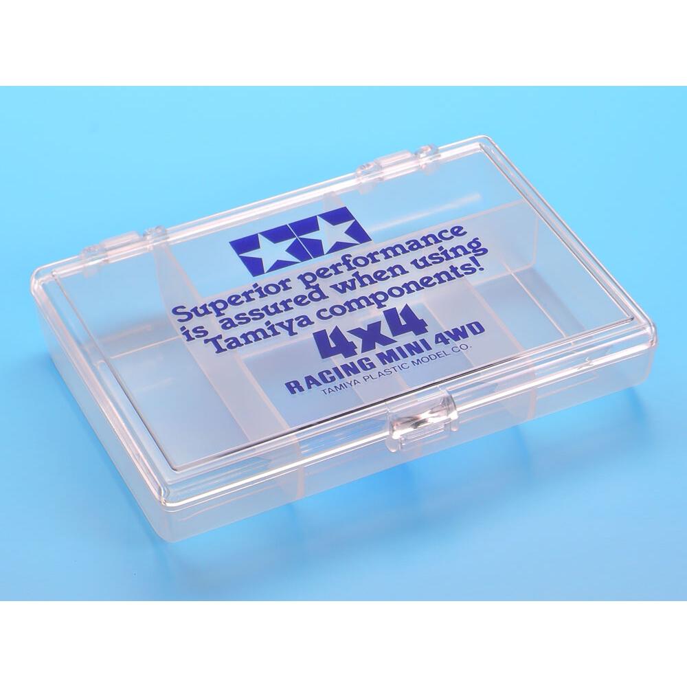 【 パーツを整理してセッティングをもっと楽しく 】 ピニオンギヤやビス、ナットなどの細かいパーツを整理して収納するのにぴったりなケースです。半透明ホワイトのケース本体には仕切りが6つあり、パーツの分類に大活躍。ワッシャーなどのつまみにくい部品をスムーズに取り出せる、角の丸みもポイントです。また、中身がよく見えるクリヤーのフタにブルーカラーでプリントした、タミヤロゴやミニ四駆ロゴもクールな仕上がり。大きさはモーターケース2やバッテリーケース2とほぼ同じコンパクトサイズなので、レーサーズボックスにもすっきり収まります。【 スペック 】 サイズ:縦90mm、横119mm、高さ25mm。小さなパーツの分類や保管に便利です。レーサーズボックスやポータブルピットにぴったり収納できます。