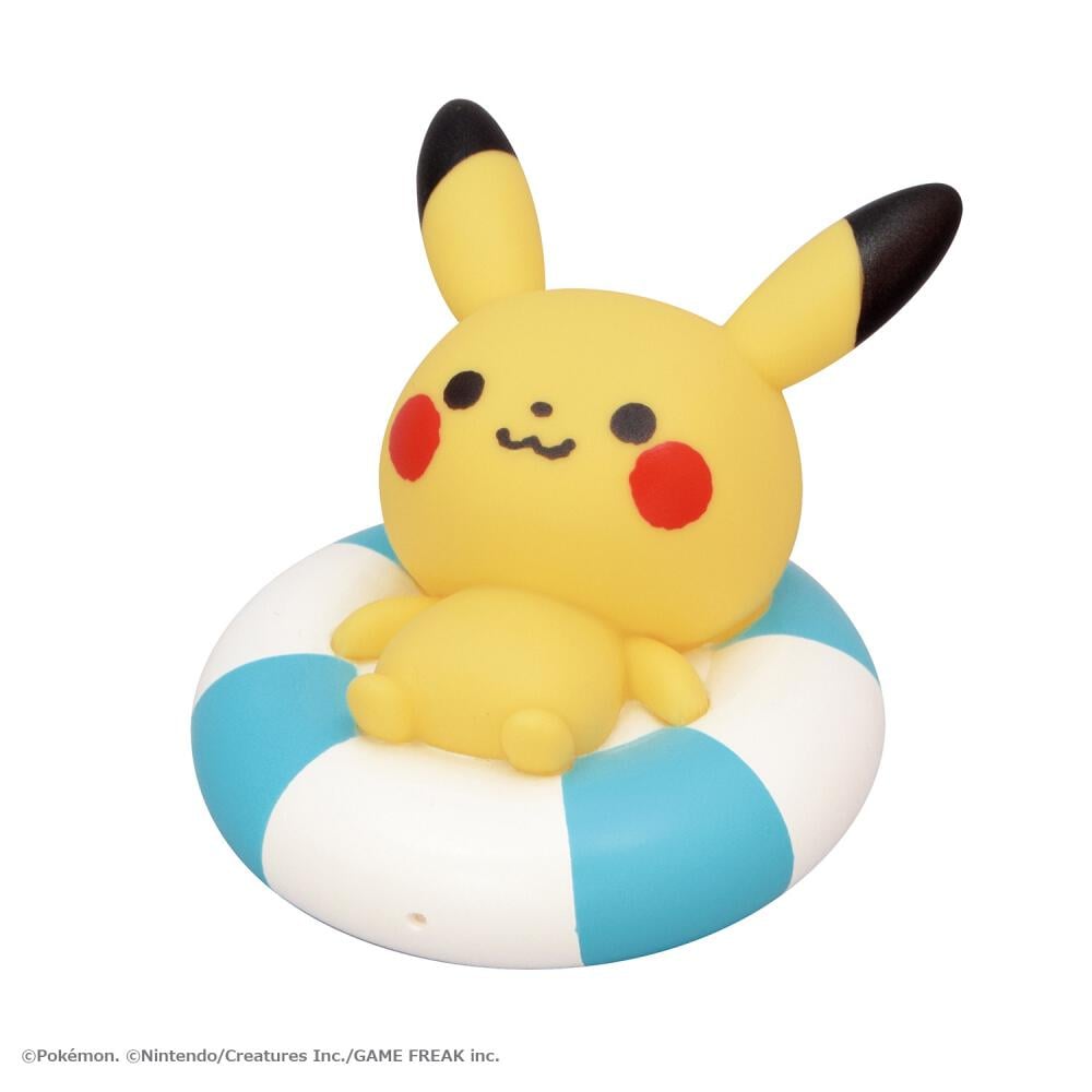 うきわに乗って気持ちよさそうにぷかぷか浮かぶピカチュウのみずでっぽう!