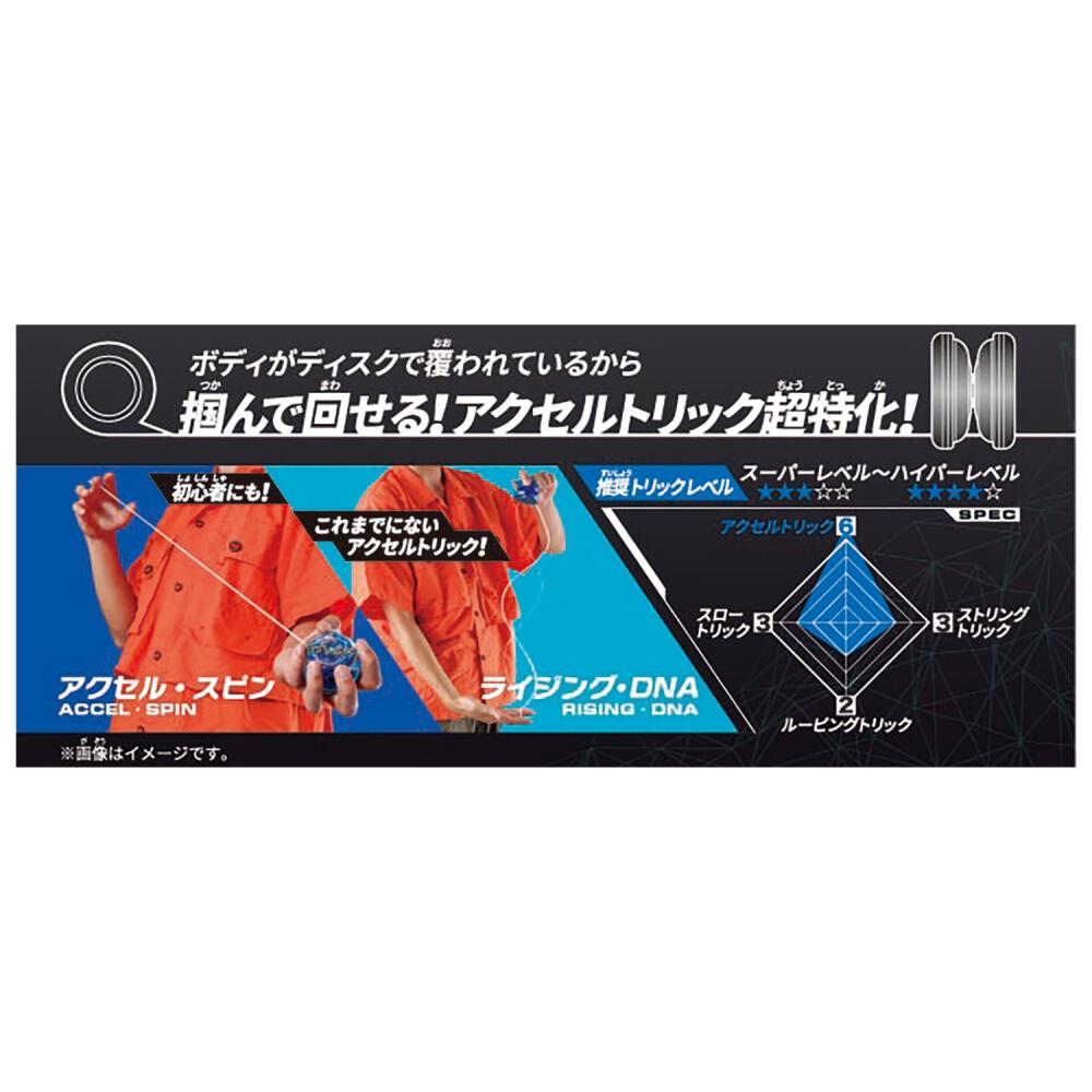本体を手に持った状態でストリングを勢いよく引くことで、本体を投げずに高速回転させることができる日米で特許出願済の新機能「アクセルシステム」を搭載したハイパーヨーヨーシリーズです。本機能を搭載したことにより、従来のヨーヨーでは再現不可能な新たなトリックが可能となりました。