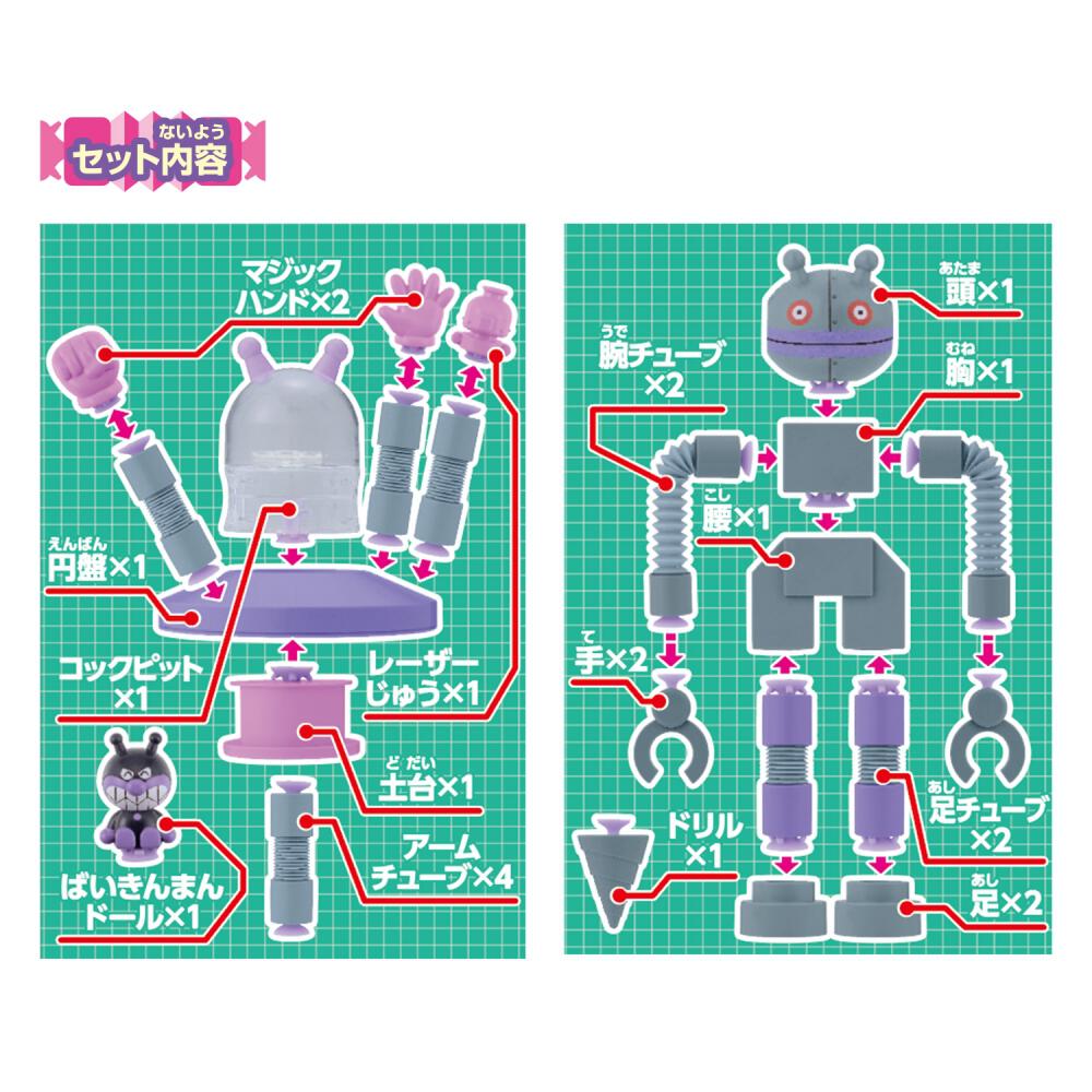 バイキンUFO・コックピット…1・円盤…1・土台…1・アームチューブ…4・マジックハンド…2・レーザーじゅう…1・ばいきんまんドール…1だだんだん・頭…1・胸…1・腰…1・腕チューブ…2・手…2・足チューブ…2・足…2・ドリル…1(本商品のセット内容以外は付属しません。)