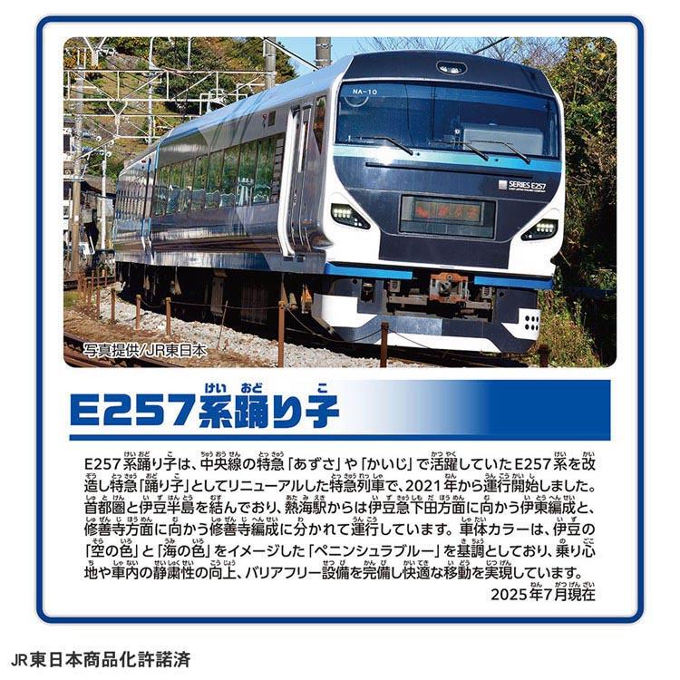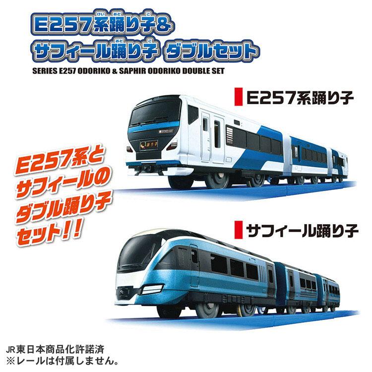 E257系踊り子はサフィール踊り子に合わせたペニンシュラブルーを基調としたカラーを再現しており、サフィール踊り子には付属のプラキッズをのせて遊ぶことができます。