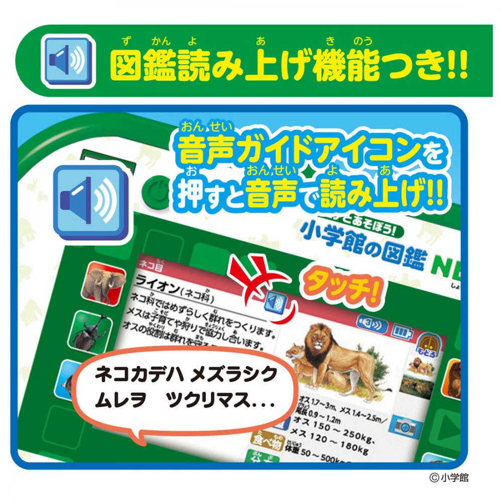 タカラトミーACアダプターTYPE5C2(別売)対応。「小学館の図鑑NEO」の人気の5冊から550種の生きものを収録した図鑑パッド!ティラノサウルスのアニア付き!