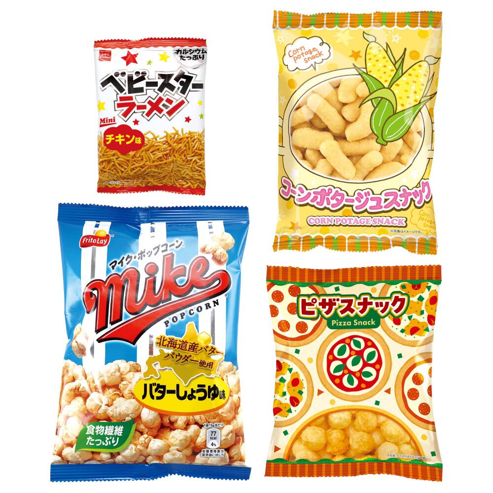 ベビースターラーメンチキン味21g、コーンポタージュスナック20g、マイクポップコーン バターしょうゆ味16g、ピザスナック10g