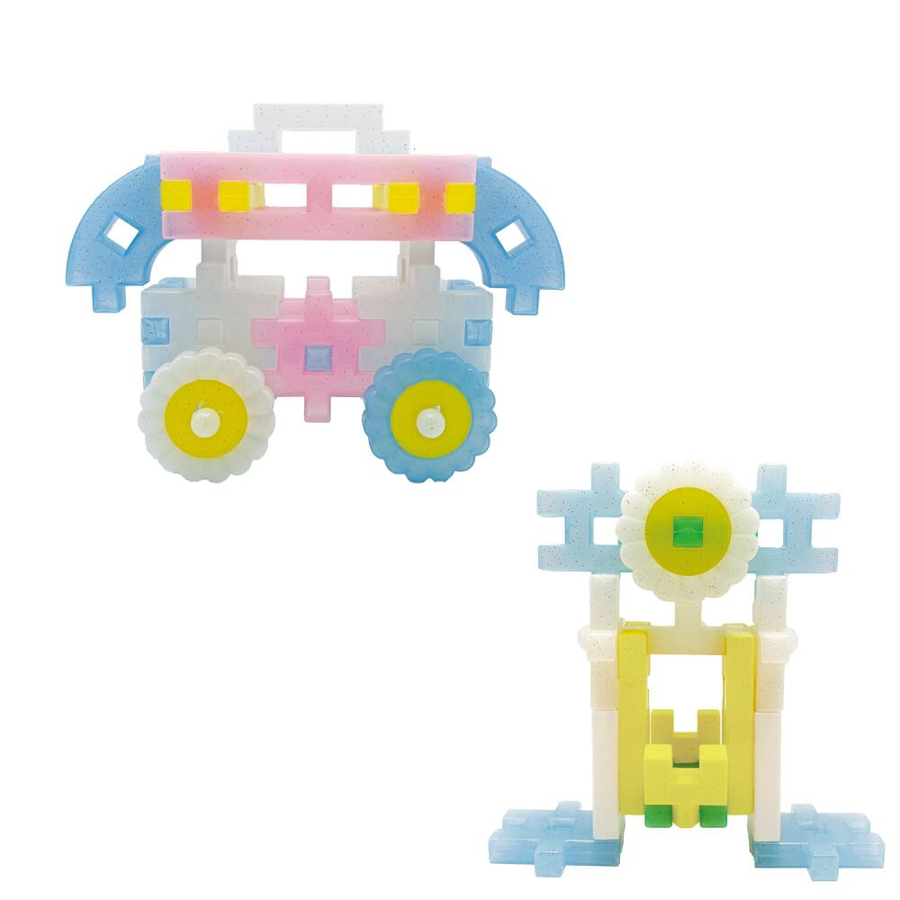 キラキラかわいい、ラメ入りのクリアカラーブロックが12種37個+耳が動くシナモンのフィギュア1個入り。