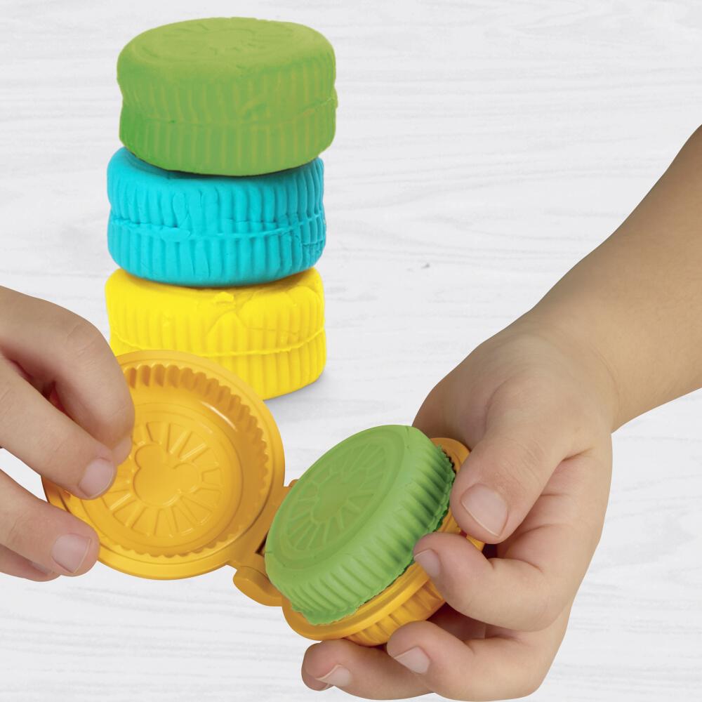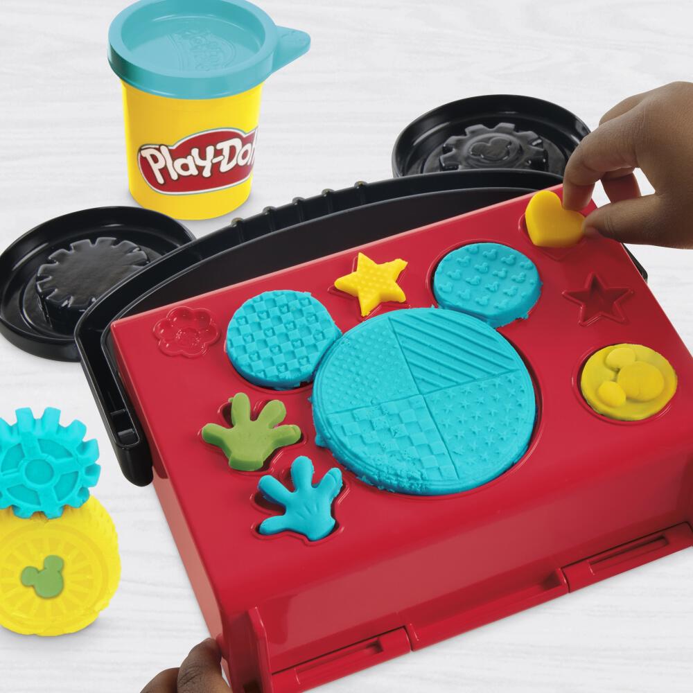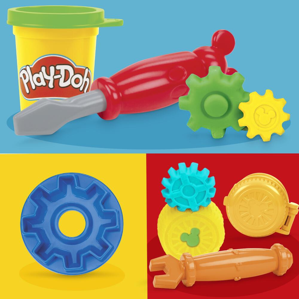 プレイセットには、底面にスタンプが付いたミッキーのフィギュア、タイヤの型、ギアの型、ドライバー、レンチ、ねんど3個が入っていて、ケースの中にすっきり収納できます。