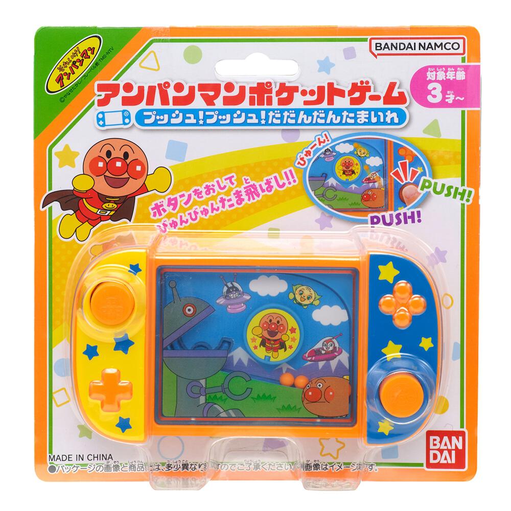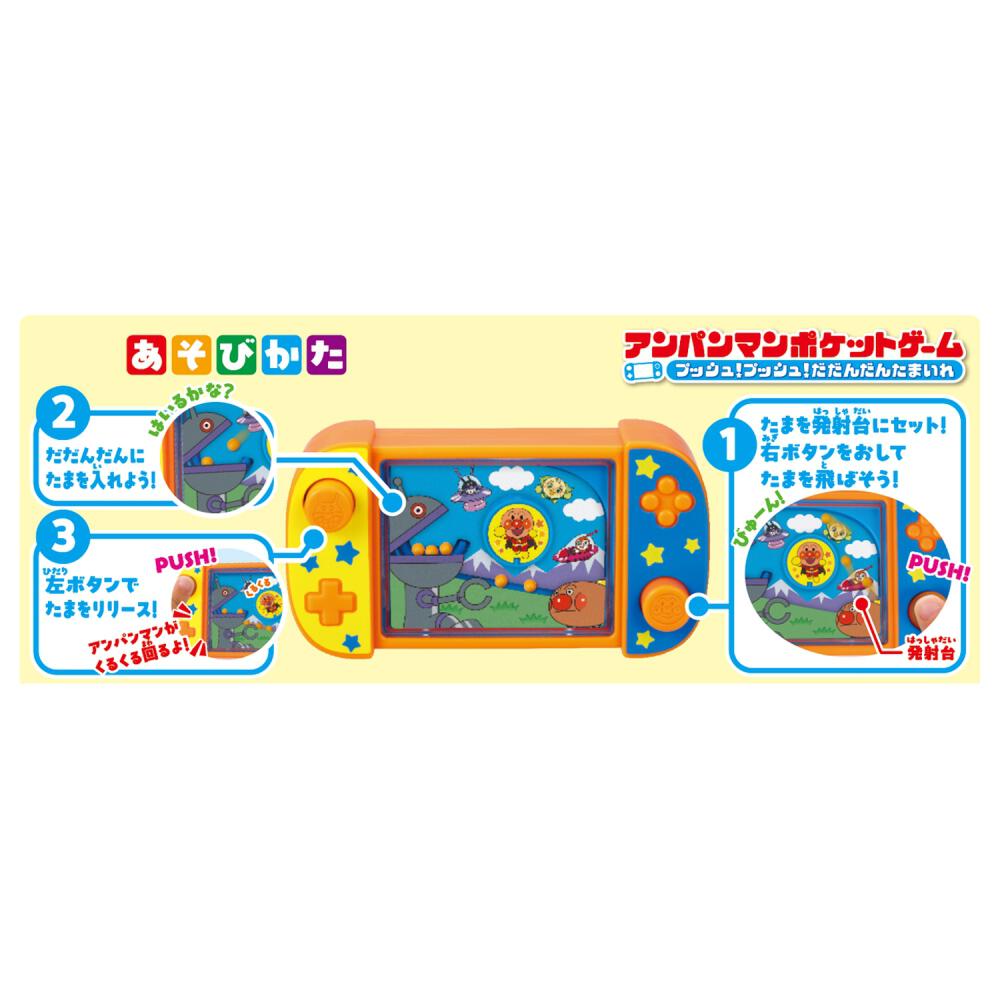 右のボタンでアンパンマンごうから玉を飛ばし、「だだんだん」を狙う、たまいれ遊びがです!