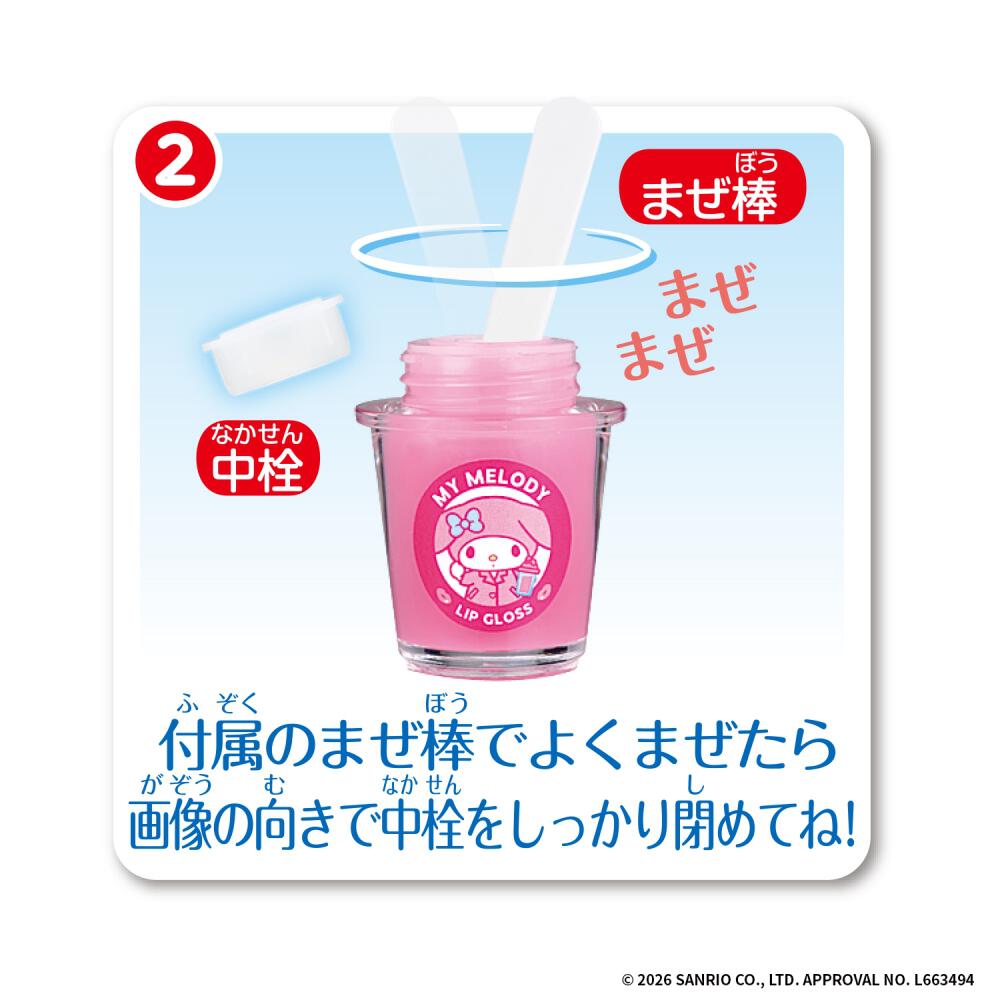 1.リップグロスの容器に、色の袋と香りの袋の中身をそれぞれ出し切り、マドラーでよく混ぜます。