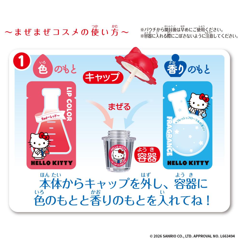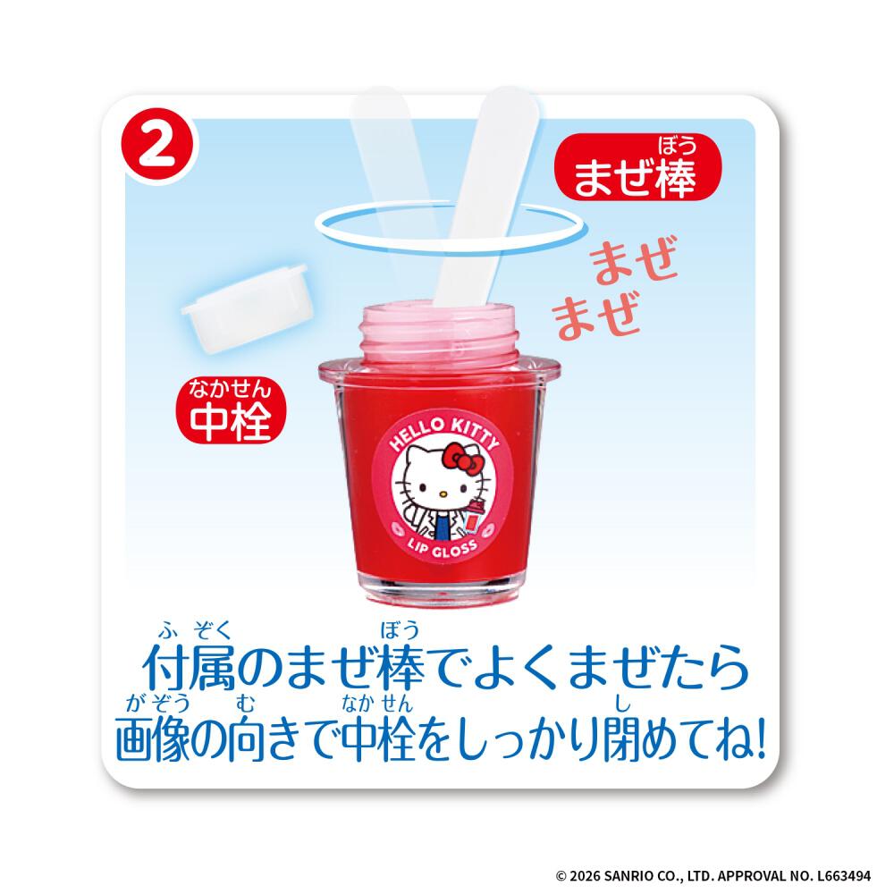 1.リップグロスの容器に、色の袋と香りの袋の中身をそれぞれ出し切り、マドラーでよく混ぜます。