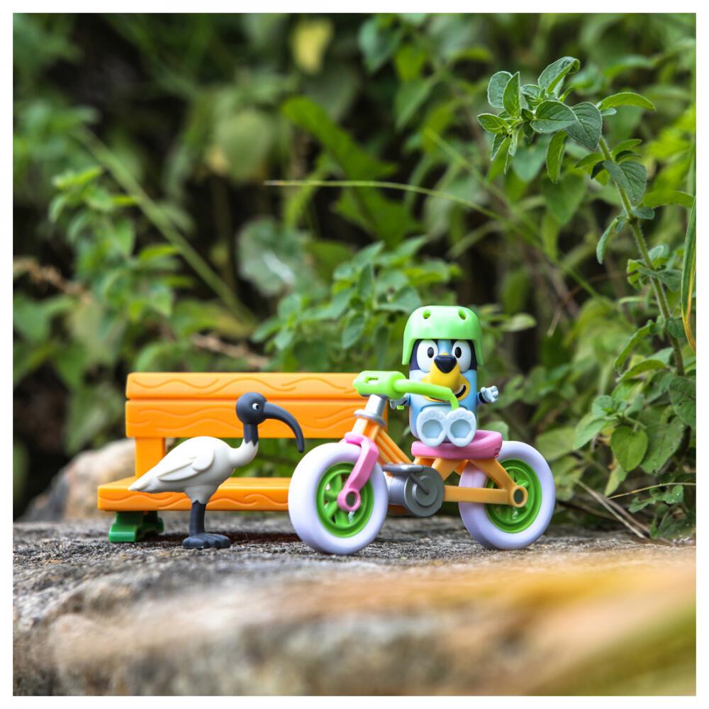 ブルーイのフィギュアとヘルメット、じてんしゃ、ベンチ、鳥がついています。