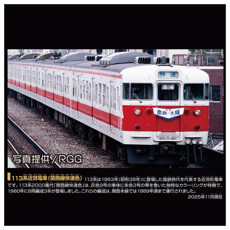 <セット内容>113系近郊電車(関西線快速色)1編成(4両)(1),クーラー(4),パンタグラフ(ハイタイプ)(1),パンタグラフ(ロータイプ)(1),前面方向幕シール(1),リアル直線レール(3),部品注文書(1),