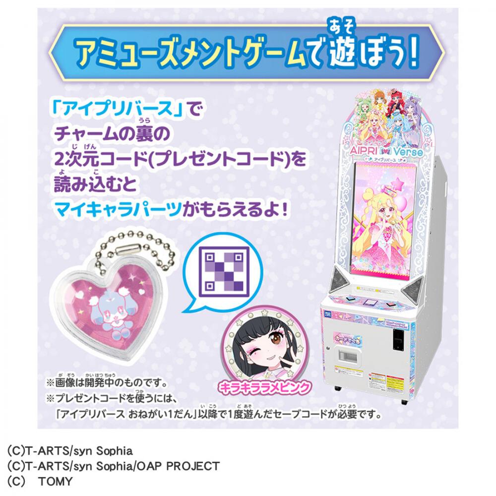 チャームの裏の2次元コード(プレゼントコード)をアミューズメントゲーム「アイプリバース」に読み込むと、マイキャラパーツがもらえます。