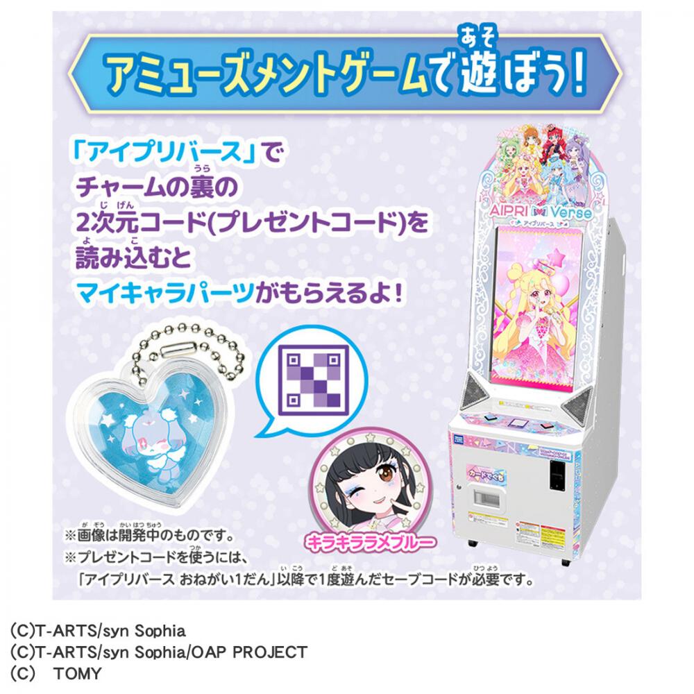 チャームの裏の2次元コード(プレゼントコード)をアミューズメントゲーム「アイプリバース」に読み込むと、マイキャラパーツがもらえます。