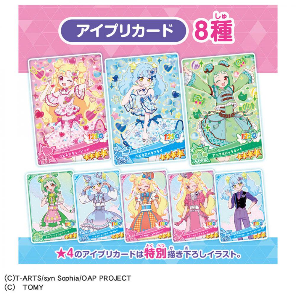 カードはアミューズメントゲームでも遊べる!1パックにはミルフィーカード(トップス・ボトムス・シューズ・アクセ)4枚とアイプリカード1枚の計5枚が封入されており、全8コーデのうち1つがフルコーデで入っています。