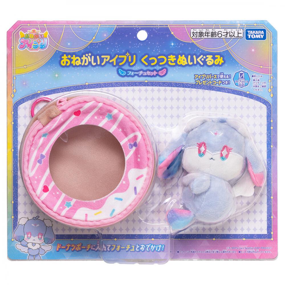 アミューズメントゲーム「アイプリバース」で使えるプレゼントコード付き。てのひらサイズのフォーチュのぬいぐるみとドーナツポーチがセットになった商品です。