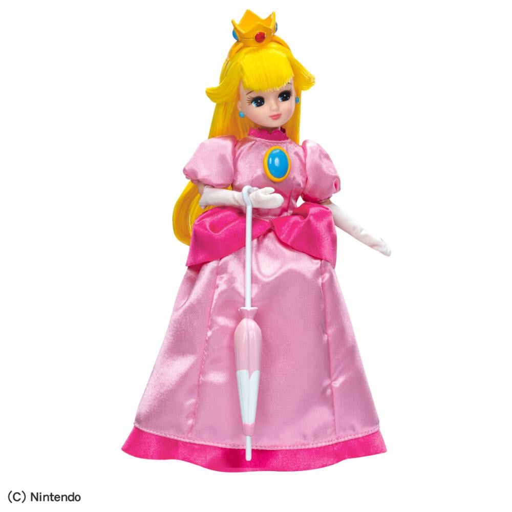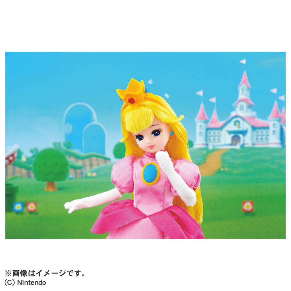 「スーパーマリオ」のピーチ姫のコスチュームを着たリカちゃんが登場!黄金色のロングヘアに、ピンクのドレスと手袋を合わせたピーチ姫コーデのリカちゃんです。冠カチューシャやドレスのブローチ、閉じた傘が付属し、どれもピーチ姫とお揃いのデザインです。