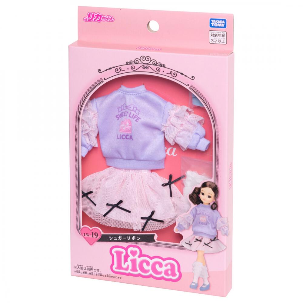 そでにフリルのついたトレーナーとリボン付きスカート、フリルいっぱいのソックス、クツのセット。