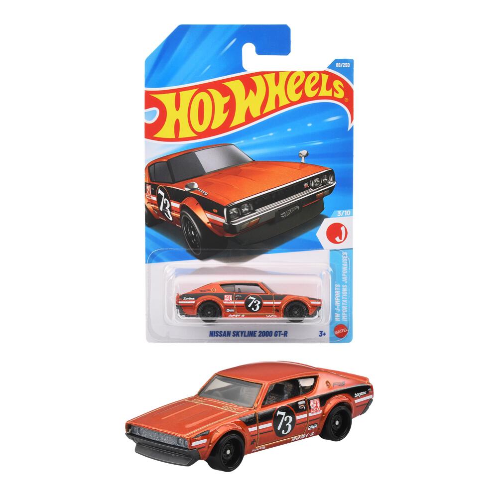 ホットウィール ベーシックカー「日産 スカイライン 2000 GT-R」は、レースでの勝利を目的に誕生した名車GT-Rがモチーフ。4代目スカイラインの通称“ケンメリ”GT-Rは、排ガス規制などの影響で197台のみ生産された希少モデルとして知られる。#73は生産年の1973年を表し、自由なカラーリングで魅力を再現している。