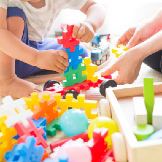 ブロックをはめたり取り出したりする動作を通じて、⼿指の器⽤さや考える⼒を育みます。