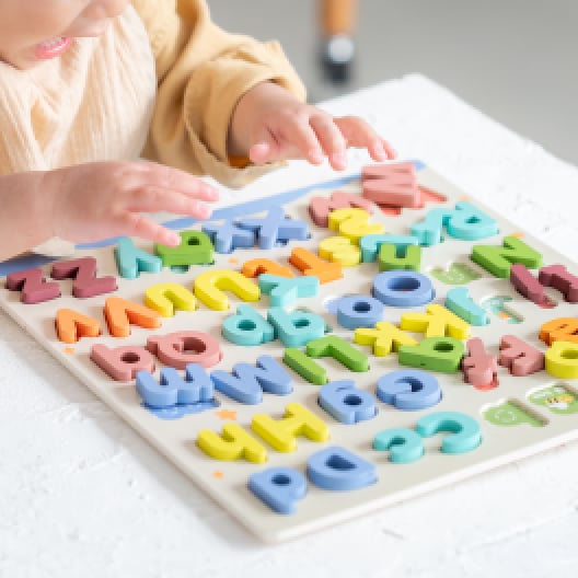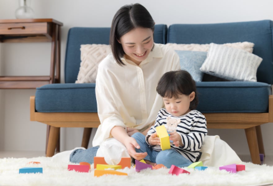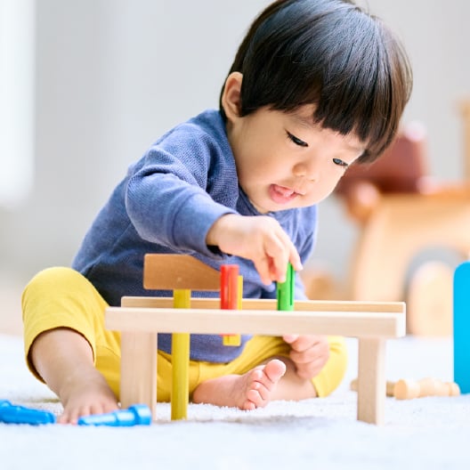 ブロックをはめたり取り出したりする動作を通じて、⼿指の器⽤さや考える⼒を育みます。